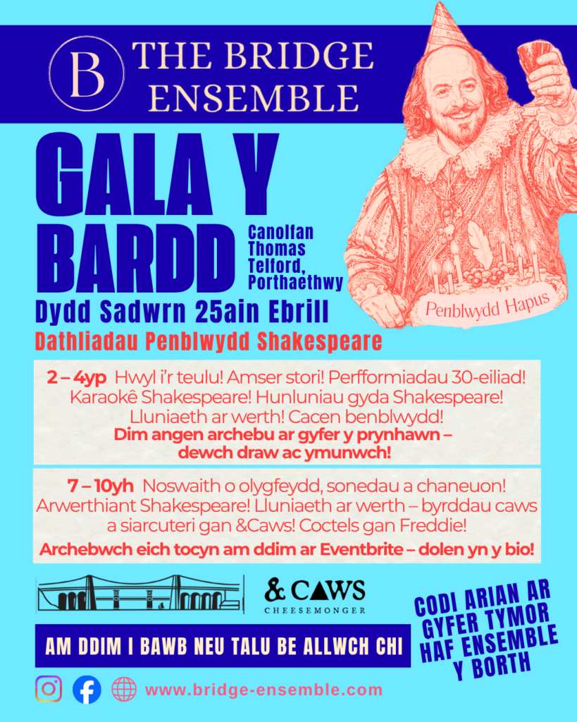 Dyma eich cyfle i ddysgu mwy am Shakespeare a chymryd rhan. Yn gwbl ryngweithiol, mi fydd yr arian a godir yn mynd tuag at ein tymor nesaf a’n cynllunia cyffrous ar gyfer ein perfformiadau haf.